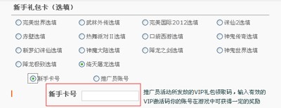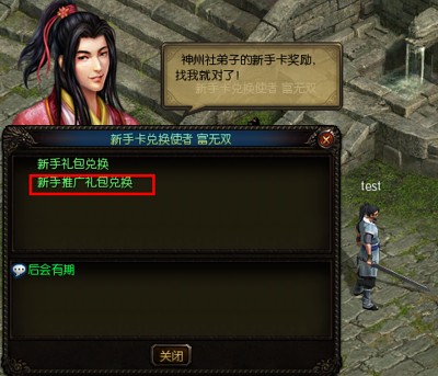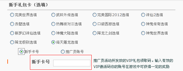为庆祝《倚天屠龙记》不删档测试开启,我们为各位亲爱的大侠准备了多种多样的超值礼包。 下面就解答一下各位大侠的新手卡使用流程: 新手推广礼包兑换 1、怎样才能进入游戏兑换新手推广礼包? 答:登录账号注册页面,选择“个性账号”或者“手机账号”注册方式的任意一种,按照页面提示准确填写真实信息,在屏幕下方方框出输入新手推广卡号。 如果是推广员账号:请选中推广员账号选项;如使用的是专属页面注册,同以上注册一样的流程领取新手卡。 2、去哪里兑换新手推广礼包? 答:不同阵营的大侠可进入到相应的各个主城点击NPC领取,如下所示: 3、怎样确认我成功领取新手推广礼包? 答:在领取礼包后系统会给予相应提示,请点击背包查看和使用礼包即可。