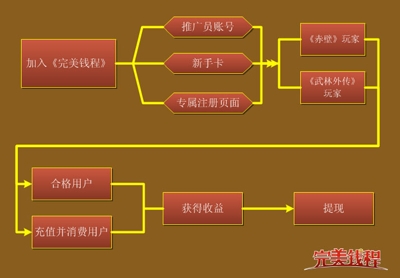 一、推广员在“完美钱程”注册后,通过推广员账号passport、兑换特权新手卡、和专属注册页面三种方式发展《武林外传》、《赤壁》玩家;