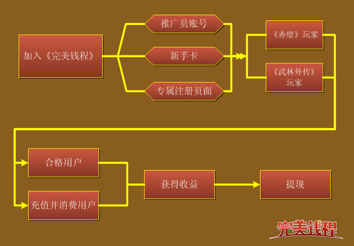 《武林外传》推广奖励:“完美钱程”用户每发展一个“合格用户”(注册日起7天游戏时长≥10小时)获得2元提成,另每发展一个充值并消费金额≥30元用户获得8元提成(活动期内注册,自注册之日起30天内充值并消费的用户)。