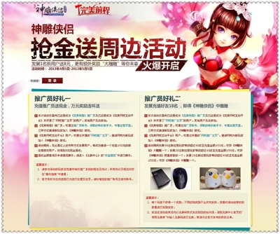 * 活动期间发展98名新注册玩家等级超过40级且充值金额≥50元,可获《神雕侠侣》大雕雕一个;发展28名新注册玩家等级超过40级且充值金额≥50元,可获《神雕侠侣》限量版鼠标一个;发展18名新注册玩家等级超过40级且充值金额≥50元,可获《神雕侠侣》中雕雕一个。