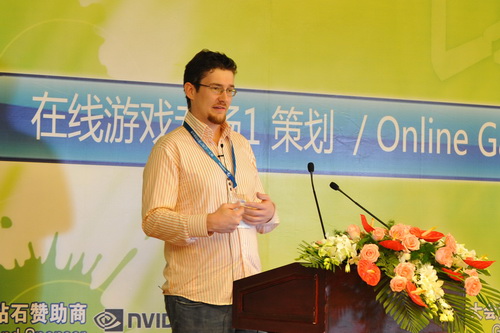 第一天我的兴致比较高,吸收的内容也比较多。第一堂听的是Riot Games的Tom Cadwell先生演讲的《竞技游戏中平衡原理和技巧的应用》,这堂课应该是我这三天里面听到的最精彩的演讲。Tom Cadwell先生参与过《魔兽世界》、《魔兽争霸》、《战争阴影》以及《黑暗王朝2》的制作,目前在腾讯代理的《英雄联盟》游戏的开发公司Riot Games担任设计总监。