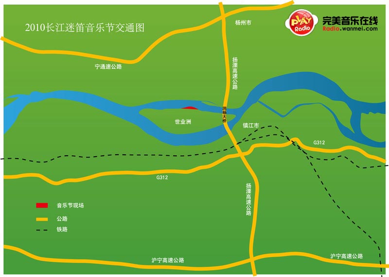 连通镇江与扬州2个千年古城,横跨长江宏伟的润扬大桥是到迷笛现场的必经之路,你从镇江自驾车到世业洲岛,可以沿长江路一直向西开,见到扬州方向的路标右拐进入镇江西收费站,取卡后出收费站沿着扬州方向路标上润扬大桥,2.5公里处你会见到大桥公园和世业字样的路标,然后盘桥(自驾车新手请注意,盘桥弯路长容易晕,建议你减低车速平稳驾驶),进入世业洲收费站,小车10元过桥费。出收费站马上到一个环岛,这时就会有显著的标识指引你到音乐节停车场,如果你来时车位已满,绕过环岛将车停在大桥公园停车场,然后乘岛上的迷笛公交专线车到音乐节现场,也很方便。