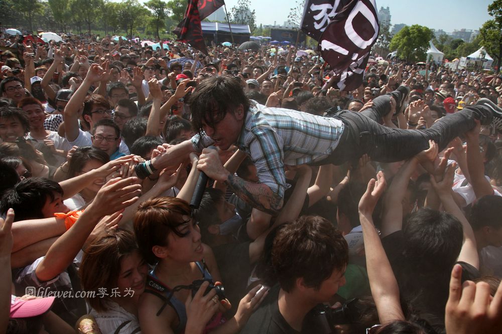 上海本土乐队Pink Berry、Boys Climbing Ropes、蘑菇团的现场接二连三的将乐迷的热情点燃,Helen带领北京实力乐团自游更称此次上海迷笛是他们近来演出感觉最爽最棒的一次现场!在北京迷笛的激情出演之后,加拿大的Your Favorite Enemies继续与上海乐迷一起疯狂的跳水,《Simple Dream》、《I want to fly》等首首名曲引发全场呼应,主唱Alex更对台下的乐迷喊“You are the future!”。来自荷兰的红发美女领衔的Ming’s Pretty Heroes以及来自日本的著名朋克乐队Good 4 Nothing更让现场乐迷大呼惊艳,Good 4 Nothing保有着朋克乐队特有的欢乐气质,不仅奉献了他们的多首经典曲目,还现场翻唱了火爆大江南北的华语金曲《红日》,引爆了现场气氛的最高潮。