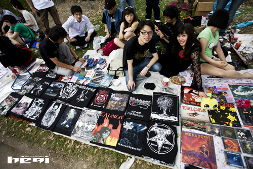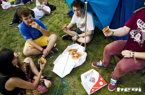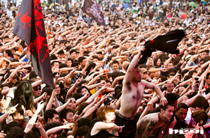 第二天的上海迷笛迎来了双休日假期的第一天,从中午时分,在世纪公园5号门售票窗口就开始排起了数百米的长队,一眼望去看不到尽头。尽管大家顶着炎炎夏日排队,可心情依然很亢奋,每位乐迷的脸上都写满喜悦的期待之情。演出开始后的两个舞台前,从观众区到后面的餐饮街再到远处的小山坡,更是满坑满谷的热情高涨,草坪已被瓜分殆尽,很多人甚至无法坐下观看演出,现场火爆到无处下脚。据统计,当天有不少于两万乐迷集结在世纪公园,加入这次摇滚上海的首次盛会。