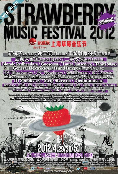 今年4月29日至5月1日,摩登天空联合SMG新娱乐共同打造“2012新娱乐上海草莓音乐节”,4个舞台,超过80组海内外艺人的整体规划,让首次在沪上亮相的草莓音乐节可以大声宣布——草莓星球正在迅速结实地撞向魔都,解放全城欢乐精神!