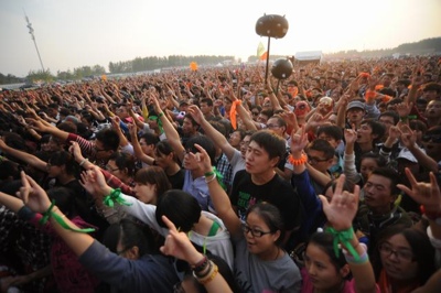 发光曲线、FuzzyMood、DocTalkShock先后在优酸乳•草莓舞台和爱舞台的开场时段“先发制人”,让现场见识了本土年轻乐队让人不容小觑的势力。之后特别有观众缘的南无乐队用他们的标准“南无文艺”台风掀翻主舞台,弹唱中不断和台下乐迷互动,全场也自此见识了他们别具一格的中国美学和国产幽默应用;紧接着上台的人气组合筷子兄弟引发了今日音乐节第一个绝对高潮,虽被确诊咽炎的肖央却台风不减,早已被广为传唱的数首代表作如《父亲》、《老男孩》不出所料引发全场大合唱,所有理想摩登青年都为这线下的真实励志之声所动容;灵魂歌后黄小琥之后登台,女王强大气场和多年金曲为场内不断升温;“Beijing Calling”Carsick Cars的内敛反叛的广场之声在台下点燃了全部青春的热情,pogo跳水不断。