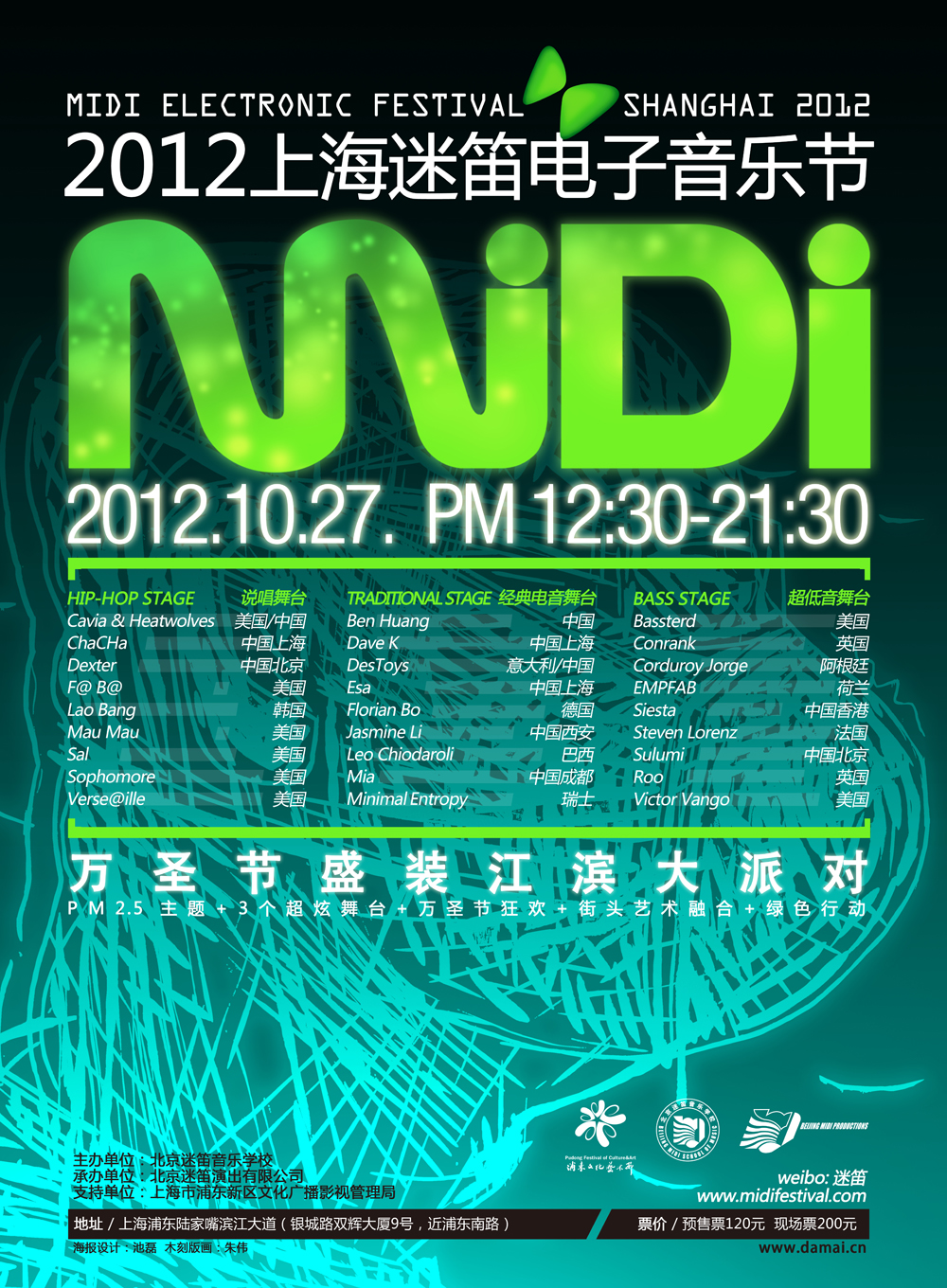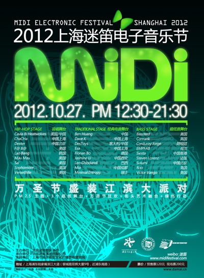 2012上海迷笛电子音乐节将于10月27日在浦东陆家嘴滨江大道盛大举行,这将是上海有史以来的第一个户外电子舞曲音乐节,现场的3个露天舞台以及27组中外电子音乐人/乐队组合将为电音爱好者们打造10小时不间断的狂欢派对!