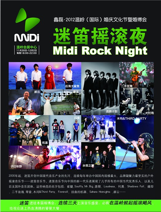 受邀进驻2012温岭(国际)婚庆文化节暨婚博会的“迷笛摇滚夜”将于11月30日到12月2日于浙江温岭会展中心的户外广场盛大举行。