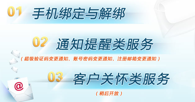 短信服务采用手机一对一的与账号绑定,短信解锁的方式,使盗号者对您的账号无从下手,使您的账号更加