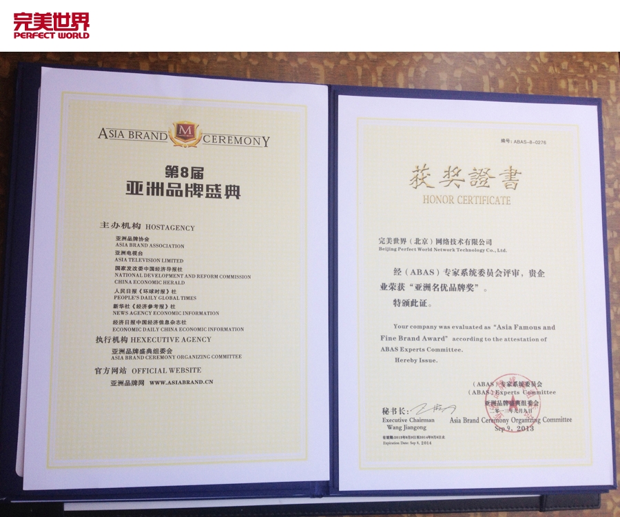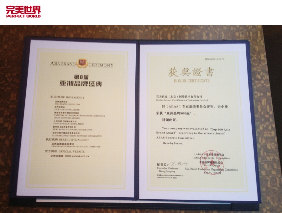 2013年9月9日,第八届亚洲品牌盛典在香港举行,完美世界荣获两项大奖——“亚洲品牌500强”和”亚洲名优品牌奖”,这是对其多年来品牌知名度及信誉度的充分肯定,同时也创下了整个游戏行业获此殊荣的先例。