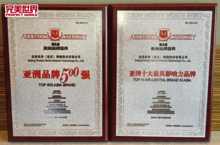 2014年9月9日,以“大文化、大商圈、大数据” 为主题的第9届亚洲品牌盛典在香港盛大举行,备受关注的2014亚洲品牌500强排行榜及各大奖项隆重揭晓。中国游戏企业领导品牌完美世界不仅再次入围“亚洲品牌500强”榜单,同时在相关奖项评比中再获突破,与韩国三星、日本本田、中国海运、生命人寿等亚洲知名企业一起,荣膺“亚洲十大最具影响力品牌奖”,并成为多年来获得“亚洲十大最具影响力品牌奖”的唯一游戏企业。