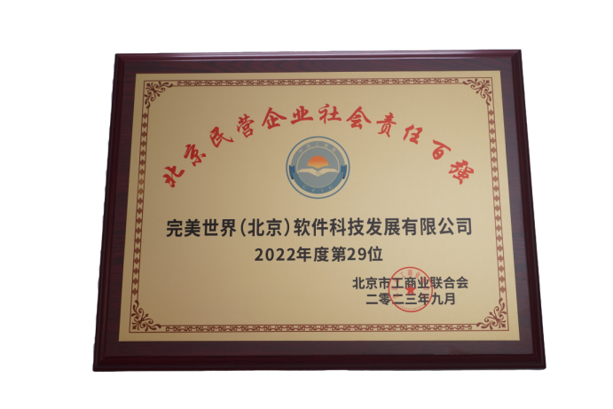 近日,在北京市委统战部指导下,北京市工商联联合有关部门举办了“2023北京民营企业百强发布会”,会上发布了2023北京民营企业“1+4”百强榜单和调研分析报告。完美世界凭借领先的科技创新能力以及在低碳环保、乡村振兴、公益帮扶等社会责任领域的积极探索与突出贡献,荣登“北京民营企业科技创新百强”“北京民营企业社会责任百强”榜单,这是完美世界连续三年获得此两项殊荣。