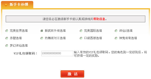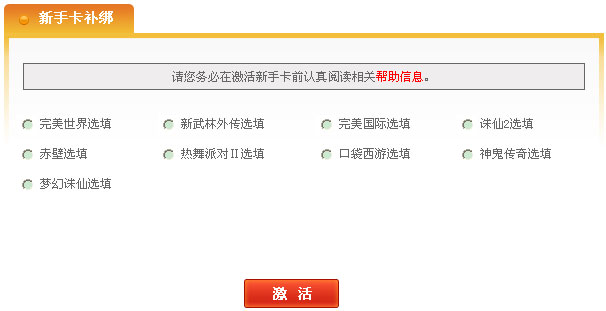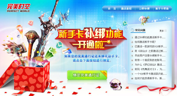 步骤一:打开完美新手卡首页(http://www.wanmei.com/xinshouka/),点击页面中部“绑定完美通行证”或头部导航“立即激活”,登录账号后,可进入新手卡激活页面。