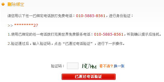 步骤四:解除绑定电话拨打010-5885-8561,听到确认提示后挂机。选择“已通过电话验证”,便可以删除掉所绑定的电话。