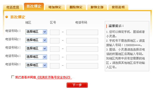 步骤三:进行电话号码输入,(固定电话、小灵通需输入区号),如果未列出的地区可以选择“其他地区”自行输入“区号”填写好后点击下一步。每个账号可以绑定5部电话或手机(手机用户无需输入区号)。