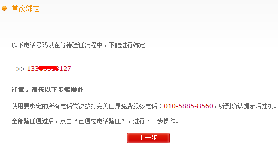 步骤四:用输入的电话拨打010-5885-8560,听到确认提示后挂机。选择“已通过电话验证”,便可以绑定电话,您可以在“电话密保”标签栏中查看绑定状态。
