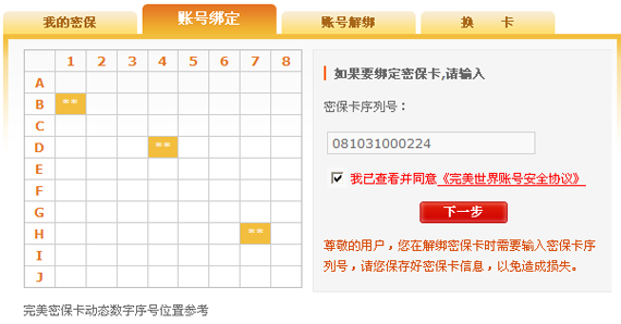登录完美通行证后,在“账号管理”页面中选择“常用功能”的“密保卡”按钮,在打开的“我的密保”页面选择“账号绑定”标签,立即绑定密保卡。首先,查看并同意《完美世界账号安全协议》,按照操作提示输入要绑定的密保卡的序列号。
