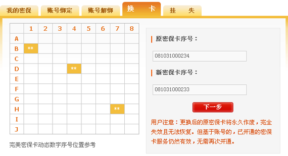 在“账号管理”页面中选择“常用功能”的“密保卡”按钮,在打开的“我的密保”页面选择“账号解绑”标签,立即解绑密保卡。按照操作提示,第一步输入账号目前正在绑定中的密保卡的序列号,以及输入新绑定的密保卡序列号。